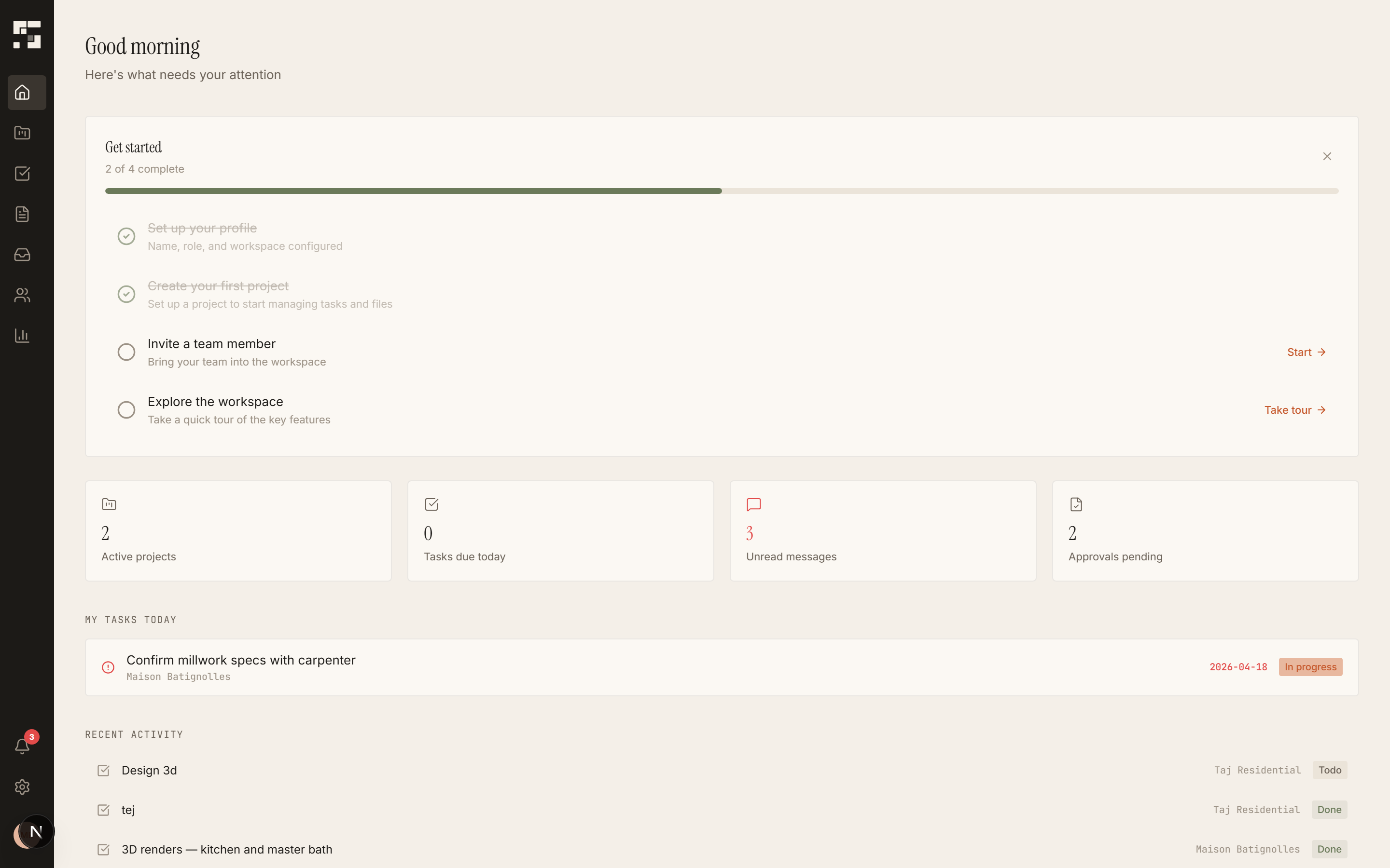 Plans, specs, and the people building it — in one shared room. Project management built for finishing contractors, architects, and design studios.