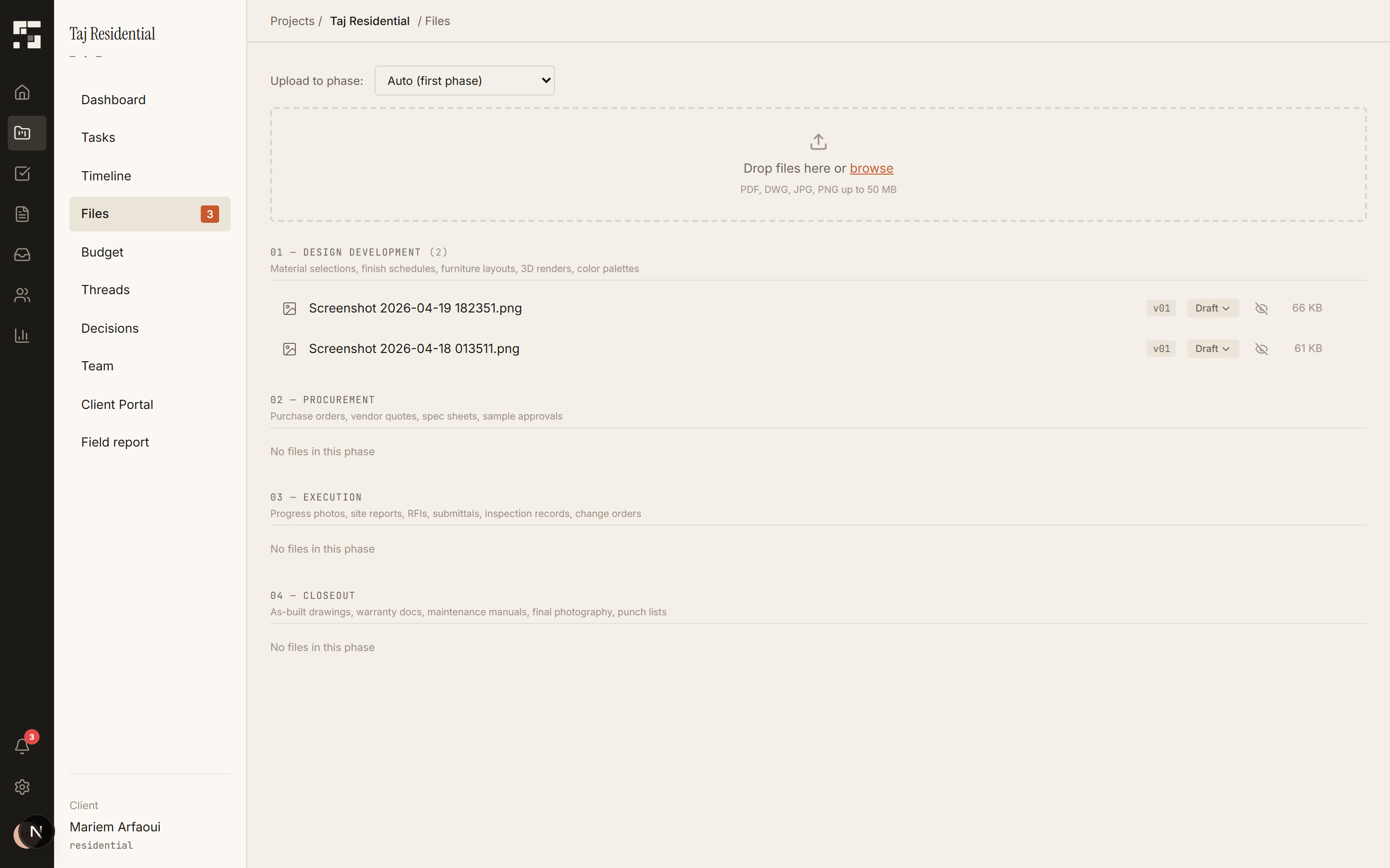 Clients get a portal link to review progress, approve files, and sign off on phase gates. No app download needed.