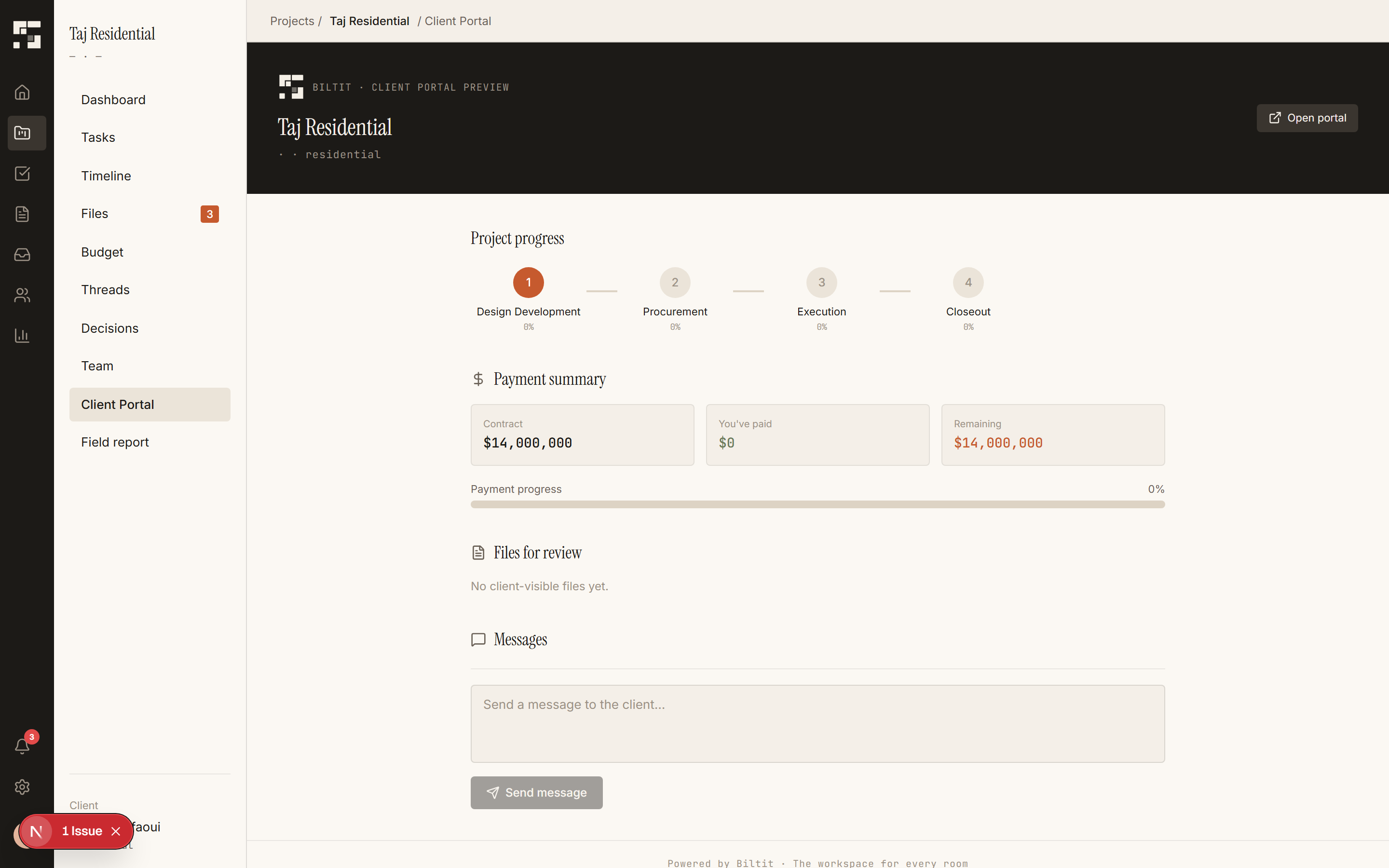 Manage phases, assign tasks, upload drawings, track budgets — everything in one shared room per project.